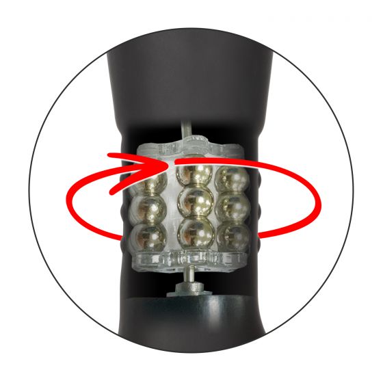 The sleek wristband remote controls the 12 functions of vibration and a rotating beaded shaft for intense sensation.