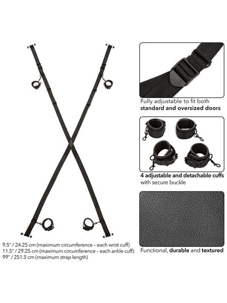 The Nocturnal Collection Over the Door Cross is fully adjustable to fit both standard and oversized doors, ensuring a versatile and secure experience. It comes with 4 adjustable and detachable wrist and ankle cuffs, each featuring secure buckle closures for comfortable and controlled restraint. Universal clasps and D-rings with a swivel design offer full dexterity, enabling a wide range of movement and positions.