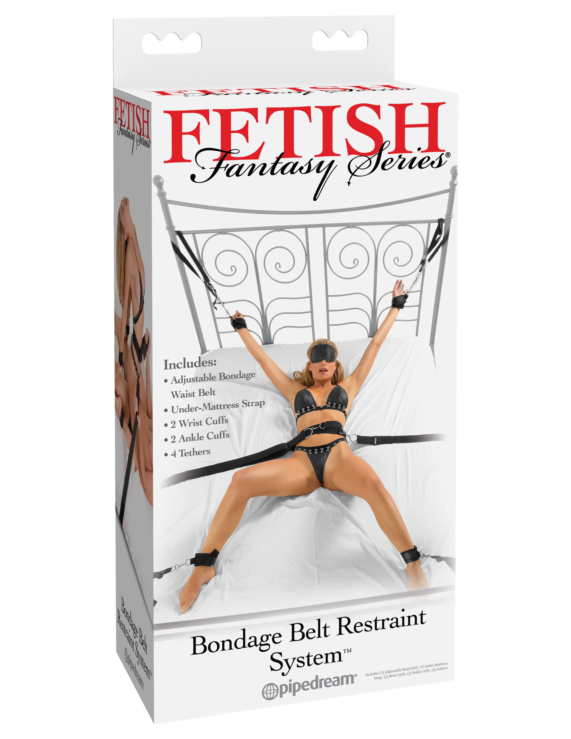 The fetish fantasy bondage belt restraint system will turn your bedroom into the ultimate erotic playground. Perfect for beginners and seasoned enthusiasts alike, the kit comes complete with an adjustable bondage waist belt, adjustable under-mattress restraint strap, ankle cuffs, wrist cuffs, 4 tethers, and free satin love mask.