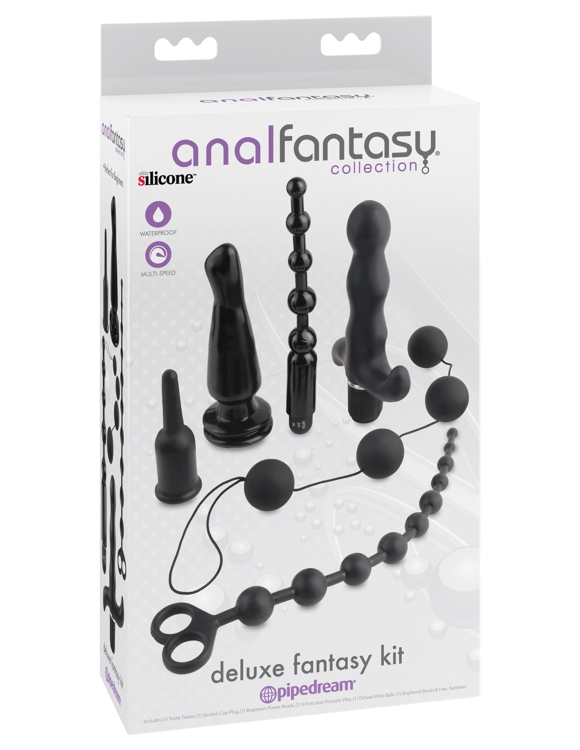 The Deluxe Fantasy Kit features six unique pieces perfect for your first-time anal encounter. Try the Boyfriend Beads for gradual anal stimulation, the 9-Function Prostate Vibe to hit just the right spot, or the suction-cup plug for a wall banging good time! Try filling yourself with any piece during other sexual stimulation and you'll climax harder than ever before!