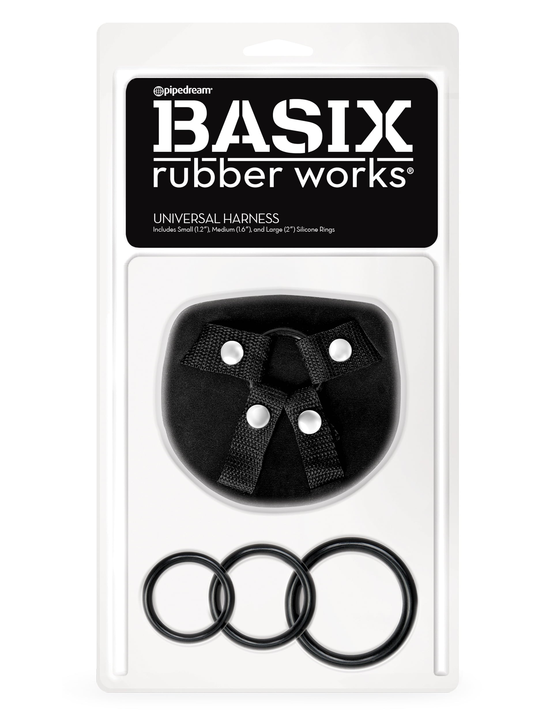 The Basix Universal Harness is available in Regular and Plus-Size and includes 3 silicone rings. Easy to adjust and fun to use for sexy strap-on play. Most of our Basix dildos are Strap-On ready and Harness Compatible.