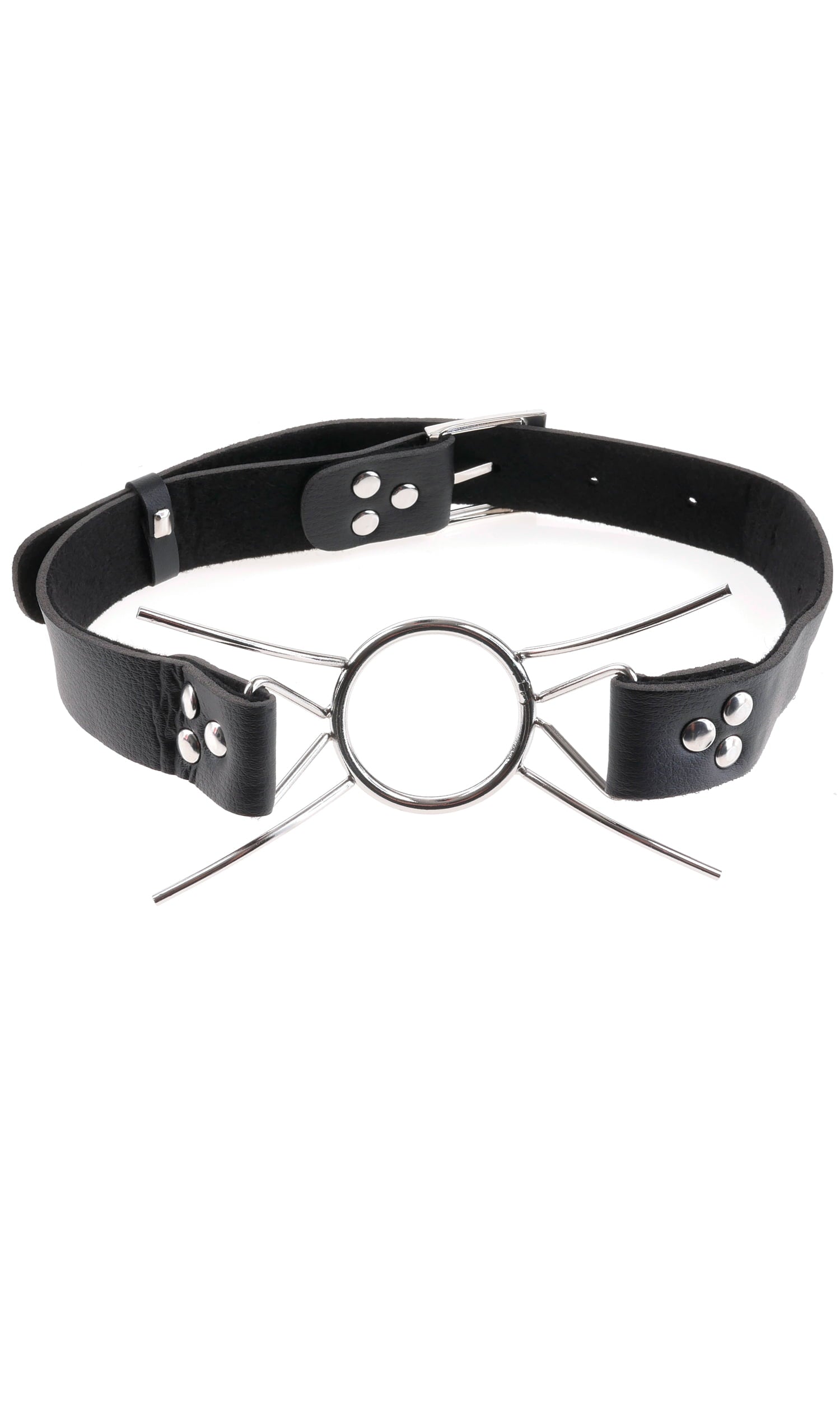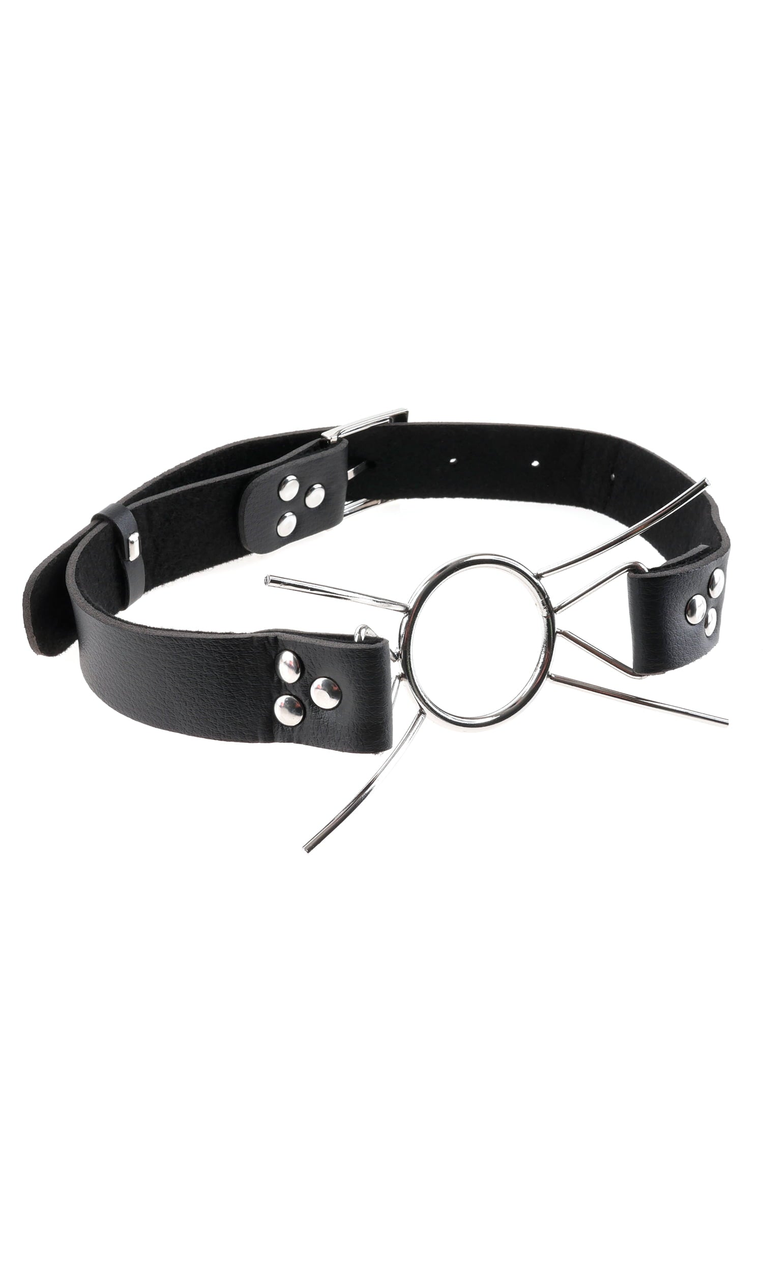 This extreme gag consists of a steel ring with four curved metal "legs" attached to the ring. The gag and legs prevent the mouth from closing, leaving your subject's mouth wide open for whatever you wish to put in it.