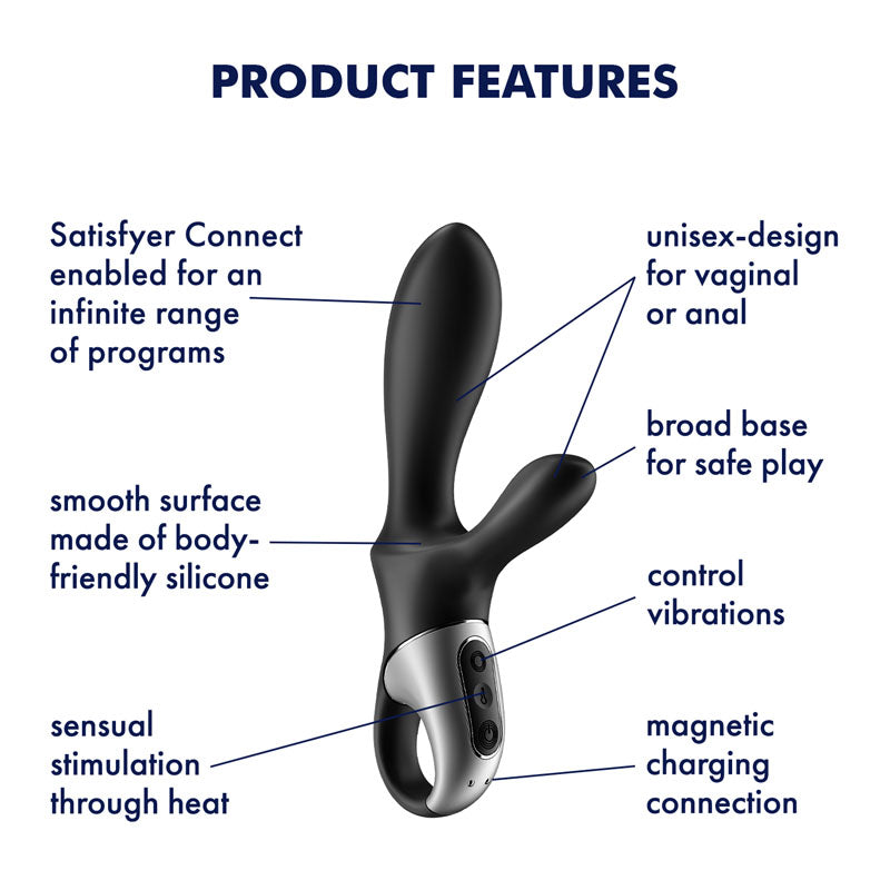 With a drop-shaped shaft and rounded tip, the Heat Climax+, a curved vibe, will fill you with targeted P-spot or G-spot, and clitoral sensations. Enjoy a realistic experience as this slightly bendable and unisex heated vibe gets up to body temperature, matching your energy! Grab a hold of the Heat Climax+ using the Vibes collection signature handle, allowing for better grip and more comfortable holding. Have a safe adventure as the Heat Climax+ comes equipped with a broad base at the bottom. Enhance your experience even more by taking advantage of the additional clitoral stimulator, which can also be used to stimulate the perineum. Bluetooth enabled, the Heat Climax+ connects to the award-winning, free, Satisfyer Connect app, giving you the option to control the powerful motors independently and truly customise your pleasure. The Heat Climax+ is made of body-safe silicone, is rechargeable, and is waterproof (IPX7) rated.