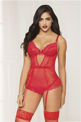 Lace and mesh teddy with underwire satin ribbon bow with charm keyhole front detail flutter leg opening satin belt adjustable straps removable garters and snap crotch.
