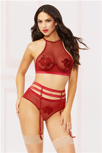 Three piece bra set. Mesh high neck bra with applique detail, garter belt, and panty.