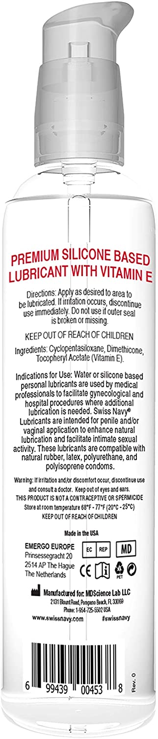 Swiss Navy premium lubes come in a leak proof bottle with a convenient single-hand pump for easy, non-interruptive applications. SWISS NAVY is perfect for any intimate activity requiring extra lubrication and less friction. The sleek packaging is designed to be on the night stand not in it.